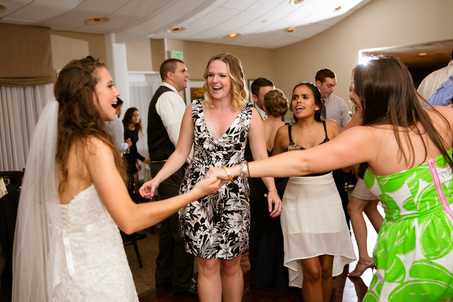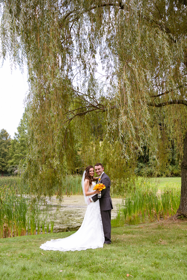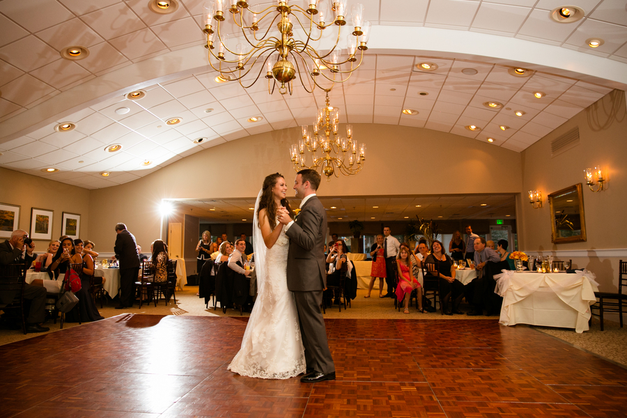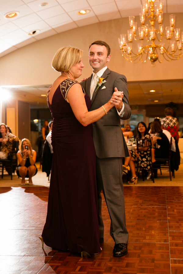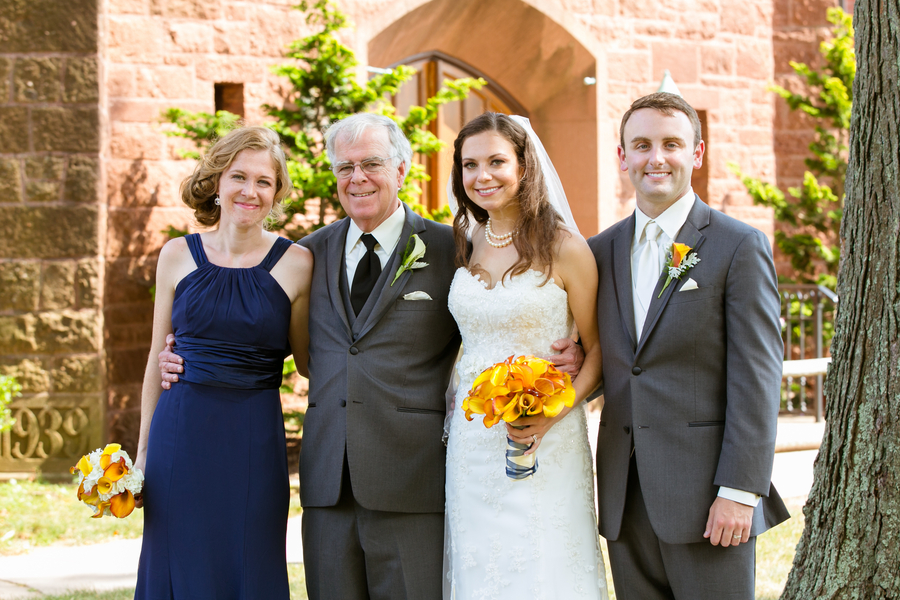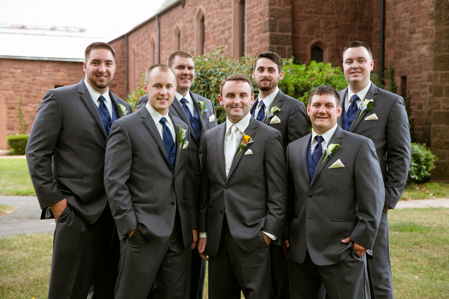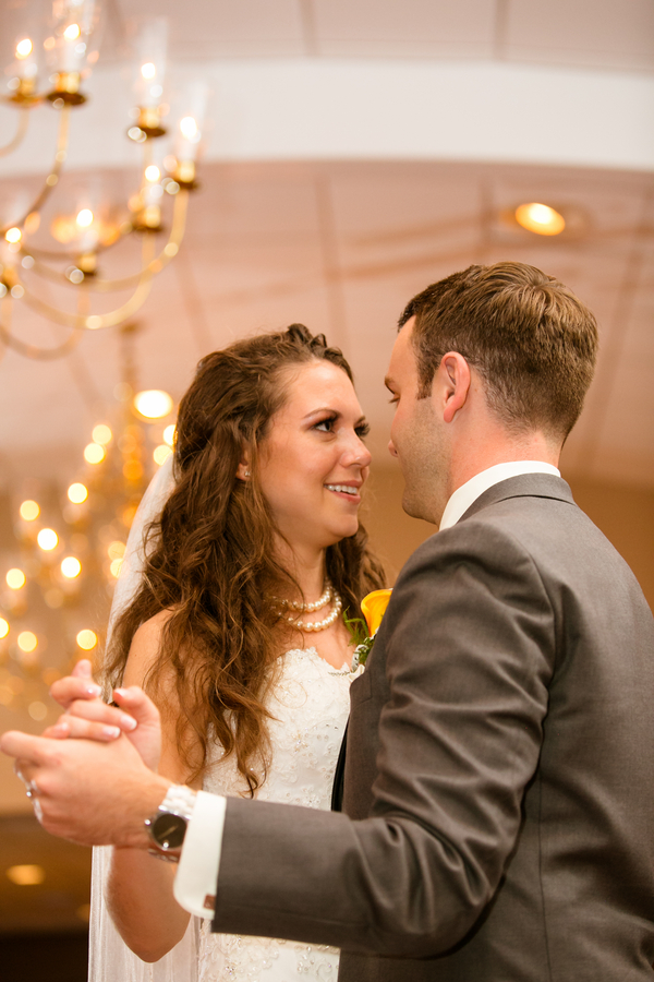 We knew we were in a for a treat right away when gorg wedding invites from Wedding Paper Divas, a prettier-than-pretty Maggie Sottero dress, and a super unique yellow bouquet by Flowers From the Farm showed up right away in the shots captured by Candace Jeffery Photography. C’mon, with details like that, you know you’re in for something amazing. As suspected, we were right on the mark — the duo’s traditional ceremony at the Church of the Blessed Sacrament and the subsequent traditional meets fall luxe reception at the club were both warm, homey, and completely perfect, all the way from the seriously scrumptious (and fabulous!) cake from Patty Cakes to the fun night of dancing that topped of their day.